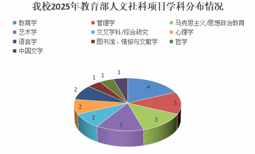 我校本次立项项目涉及10个学科门类,其中,教育学4项,马克思主义/思想政治教育、管理学和艺术学各3项,语言学、心理学和交叉学科/综合研究各2项,哲学、中国文学和图书馆、情报与文献学各1项。