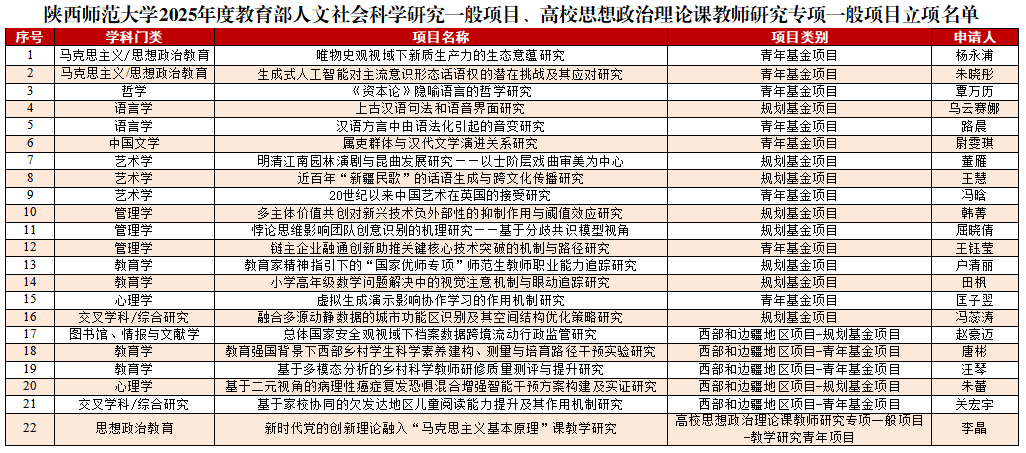 教育部人文社会科学研究项目是高水平项目的代表性项目之一,体现了高校的哲学社会科学研究水平和学术影响力。我校积极开展有组织科研,紧跟国家需求,夯实学术根基,推动学科交叉,持续发挥高水平项目的示范引领作用,为哲学社会科学繁荣发展贡献师大力量。